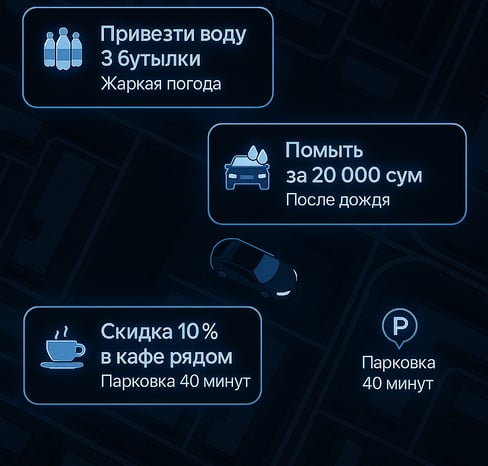 Интеллектуальная цифровая платформа, которая автоматически активируется при парковке и предлагает водителю полезные и персонализированные сервисы — от мойки до доставки кофе.