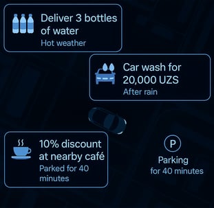 Smart notifications - "Rain soon - insure the car," "After a sandstorm - it's time to wash the car" - our platform will tell you.